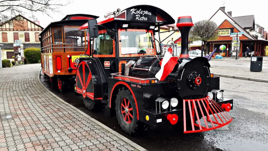 Godzinna wycieczka ciuchcią drogową! Trasa obejmuje widoki okolicznych miasteczek, a także Morza Bałtyckiego.