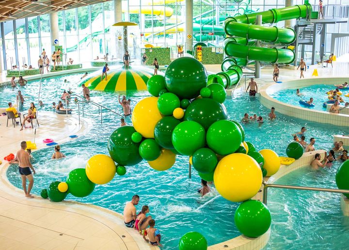 Wiele zjeżdzalni dla dzieci jak i dorosłych, baseny o różnych głębokościach, sauna, a także basen sportowy i wiele innych.